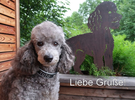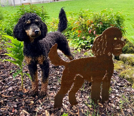 Zwergpudel, ca. 34 cm Widerristhöhe, gefertigt aus 4 mm unbehandeltem Stahlblech, mit angeschweißten Erdspießen, so kann er z.B. in den Rasen gepiekt werden.